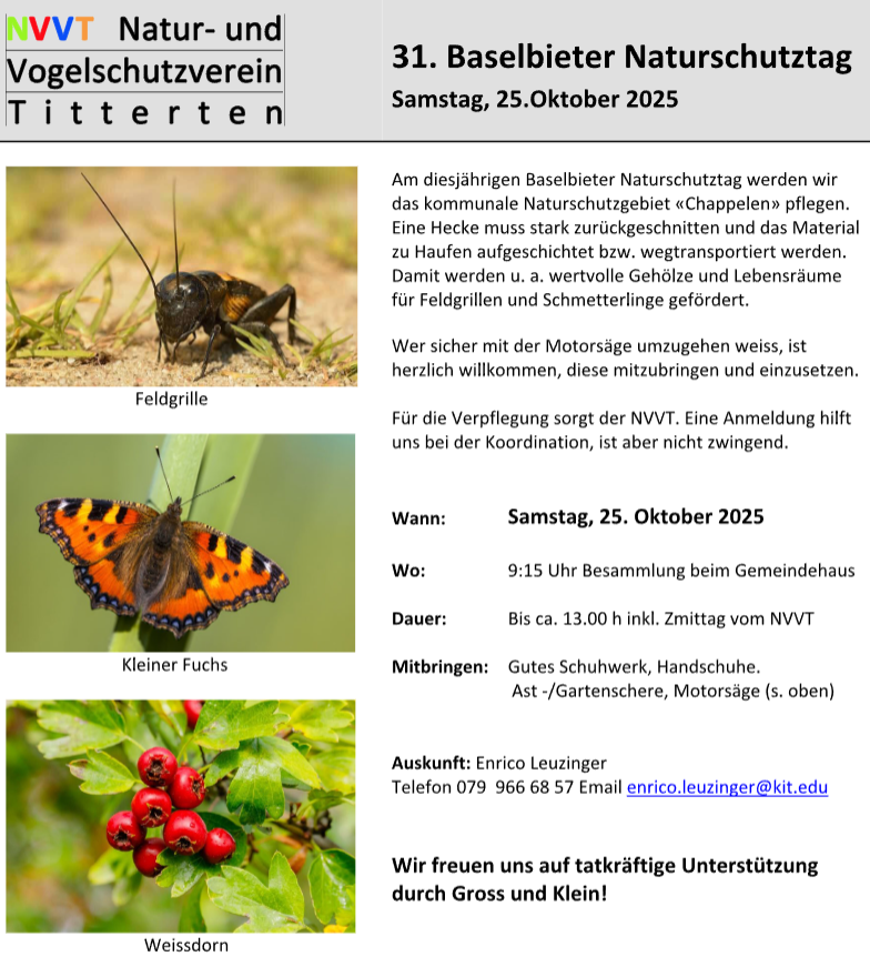 Am diesjährigen Baselbieter Naturschutztag werden wir das kommunale Naturschutzgebiet «Chappelen» pflegen. Eine Hecke muss stark zurückgeschnitten und das Material zu Haufen aufgeschichtet bzw. wegtransportiert werden. Damit werden u. a. wertvolle Gehölze und Lebensräume